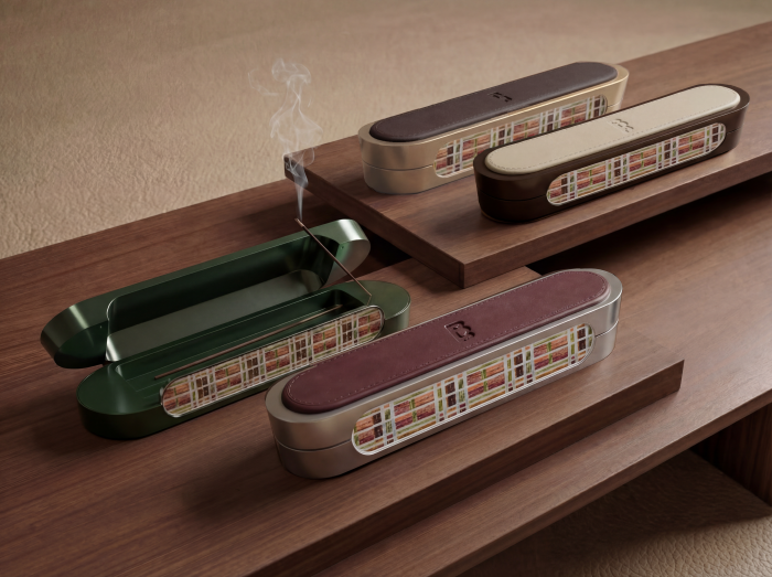 Le porte-encens imaginé par Adèle, transforme un rituel ancestral en objet sensoriel nomade et autonome. Sa structure refermable permet de l’emporter partout et la marqueterie inédite de feuilles, associée au métal, crée un dialogue subtil entre fragilité et solidité, offrant une expérience visuelle et olfactive unique. Cette approche combine tradition et innovation, matériaux nobles et design contemporain, pour un objet fonctionnel, élégant et porteur d’expérience.