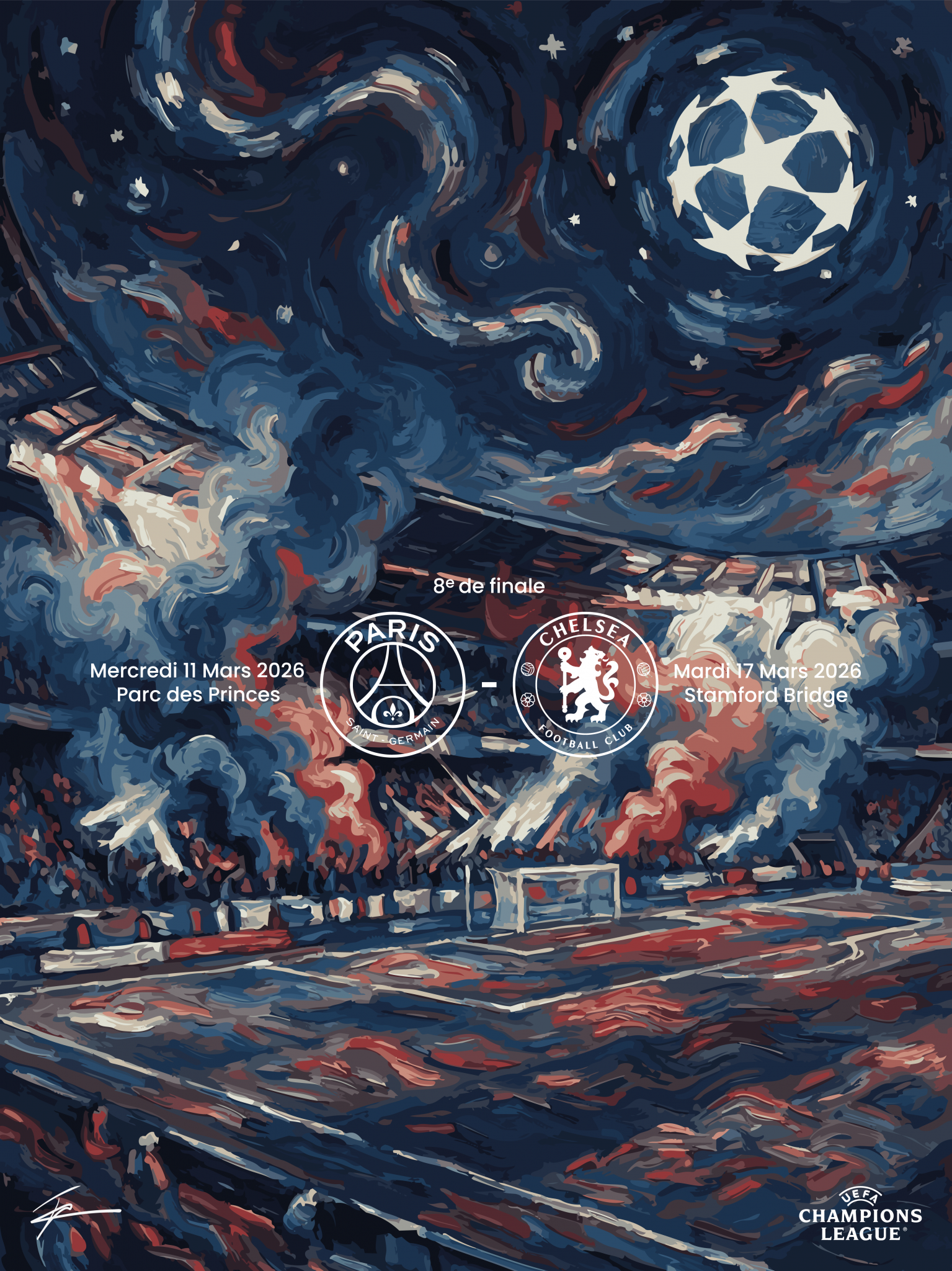 Pour le match de 8e de finale, entre le PSG et Chelsea, c’est Jules Ragot, étudiant en 4e année, qui s’est prêté à l’exercice et a imaginé une affiche inspirée du célèbre tableau « La Nuit étoilée » de Vincent Van Gogh. Ce dernier ayant vécu ses jeunes années en Angleterre et trouvé beaucoup de son inspiration en France, l’illustration symbolise le croisement des cultures françaises et anglaises. Le logo de la Ligue des Champions est érigé en lune comme s’il dominait les étoiles présentes dans le ciel et sur le terrain. Les tons principaux sont le rouge et le bleu en référence aux couleurs des deux clubs et s’entremêlent dans les fumées émanant des gradins, imageant la hargne des supporters.