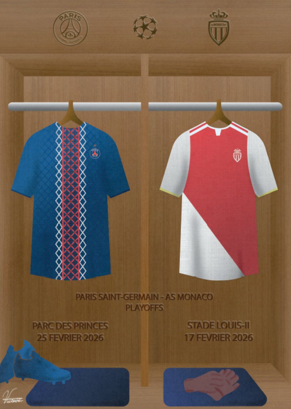 Pour le match de barrage, entre le PSG et l’AS Monaco, c’est Victoire Nikly, étudiante en 4e année, qui s’est prêté à l’exercice et a imaginé une affiche qui représente un vestiaire de football, un lieu souvent invisible pour le public mais pourtant un passage essentiel pendant le match. Si le spectacle se joue sur le terrain, l’intensité naît d’abord dans cet espace clos : c’est là que se construisent la concentration, la stratégie et surtout la cohésion du groupe. Le vestiaire est un endroit intime, presque secret, où la tension est palpable et où l’unité doit être la plus forte pour affronter l’adversaire.